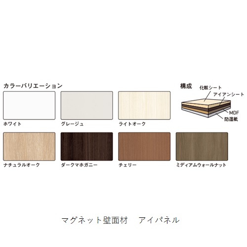[呼称] ie-0006[材質]化粧シート・アイアンシート・MDF・防湿紙 [サイズ]H900×W2400×D3.4〜3.5mm [重量]10kg 特長 ・マグネットがつく優れた意匠性の壁面材です。 ・マグネットパーツを組み合わせて、お部屋の壁のレイアウトが自由自在です。 ・上質な木目5柄、ホワイト、グレー。豊富なカラーバリエーションでお部屋の空間にとけこみます。 ・丸のこやカッターでカット可能です。施工現場での急なサイズ変更などにも対応できます。 ご注意 ・アイパネルは鉄を練り込んだゴムを使用しており、施工性、加工性に優れている分、通常の鉄板に比べて、マグネットの保持力は弱くなります。 ・モノを乗せる棚やBOX、モノを吊るすフックといったアイテムについては、市販のマグネット商品では相性が悪く弱いです。 ・マグネットの保持力は種類や形状により異なります。使用の前に必ずご確認ください。 ・R面には使用できません。 ・不燃材ではありません。 ・アイパネルは別注色、特注柄も対応可能です。900×2400mmを30枚からご注文承ります。 ・見切り材納まりの場合は、パネルに差し込んでから施工してください。 ・見切り材は裏面に両面テープ、接着剤等を使用してしっかりと固定してください。 ・アイパネルは突き付けしないでください。高温度下で伸びて突き上げを生じたり、低温度下で収縮して隙間を生じる場合があります。1以上あけてください。 ・必要に応じてプライマー処理を施してください。 ・納期:ご確認ください。