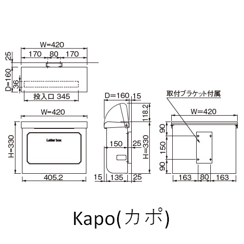 [材質] 本体:高耐食溶融めっき鋼板0.8t内フタ:高耐食溶融めっき鋼板1.2t(ブラケット:SUS304 1.5t)[仕上げ] 粉体塗装(ブラケット:ヘアーライン) [サイズ] H330mm、W420mm、D160mm [重量] 4.2kg 購入に関する注意事項 ・スタンドは別売です。別途お求めください。 ・画像は代表画像です。 ・メーカー直送の運賃は、物量とお届け先住所により変動します。詳細は担当の営業所へお問合せください。 特長 ・「上入上出」タイプです。 ・上下のゆるやかなラウンドフォルムと、前面の刻印がアクセントとなっているデザインです。 ・デザインポストでありながら大容量なポストです。 ・防滴仕様で大型郵便にも対応可能です。 ご注意 ・防滴仕様ですが、屋外への設置は強い風雨や諸条件によって雨水が浸入することがあります。 ・納期ご確認ください。
