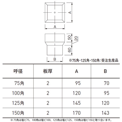 [色]シルバー[呼径]100角 [サイズ]A145mm、B120mm [備考]塩ビ管上部直接取り合い 購入に関する注意事項 備考 75角は塩ビ75、100角は塩ビ100、125角は塩ビ125、150角は塩ビ150と取り合います。 ・ブラックの価格はおよそシルバーの2割増しです。