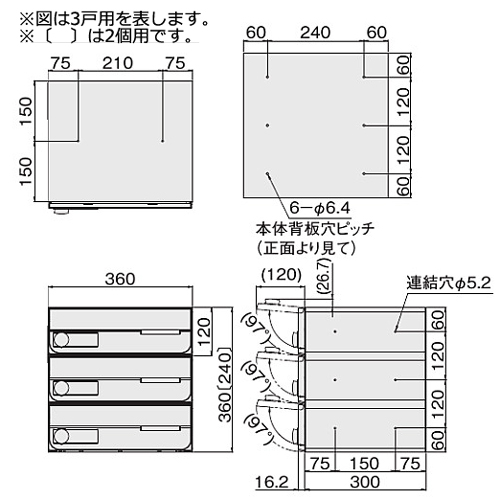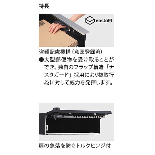 ポストW360×H120前入前出/防滴タイプ [設置場所]屋内/屋外 [投函サイズ]日本郵便推奨規格 レターパックライト [サイズ]H480×W360×D316.2mm [扉開き方向]上 [仕上]扉・投入口 ヘアーライン仕上 アクリル焼付塗装 色:クリア [材質]本体・扉・投入口 本体:PC/ABS樹脂難燃グレード 扉:ステンレス(SUS304)PC樹脂 投入口:ステンレス(SUS304) [質量]8.2kg 購入に関する注意事項 特長 ・プチ宅ユニット据置設置対応品として固定用背面パネル(別売)と組み合わせ可能です。宅配ボックスと組み合せてご使用いただけます。 ご注意 ・雨水が浸入しても郵便物が濡れにくい防滴構造を採用しております。防水構造ではありませんので、強風雨や諸条件によっては郵便物が濡れることがあります。