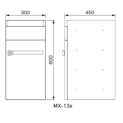 集合タイプ郵便受 前入前出 スリーサイズコンビネーションタイプ [サイズ]H600mm、W300mm、D450mm [重量]11.1kg [材質](本体)SUS304ヘアーライン仕上 [錠前]myナンバー錠 [投入口]270mm×35mm〜80mm 購入に関する注意事項 ・BL認定品です。 ・メーカー直送の運賃は、物量とお届け先住所により変動します。詳細は担当の営業所へお問合せください。 特長 ・「横型:前入前出」タイプです。MX-11e・12e・13e・14e型を互いに組み合わせることが可能です。マンションやオフィスビルなど、それぞれの専有面積や郵便量、メイルボックスの設置スペースによって、適切な大きさを選び、自由にレイアウトすることができます。厚さ35mmの郵便物が投函できる大型投入口です。MX-13e・14e型は小扉を手前に引くことにより、80mm厚の封筒や 束になった郵便物を一度に投入することができます。 ご注意 ・MX-14e型は床据え付け専用タイプです。必ず床面に設置してください。本商品同士を積み重ねて設置することはできません。 ・防水型ではありませんので屋外への設置は強い風雨や諸条件によって雨水が浸入することがあります。屋内または雨がかからない場所への設置をお願い致します。 ・屋内仕様です。 ・扉はSUS304となります。