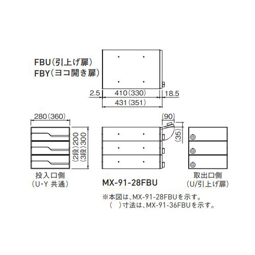[戸数]3戸用[投入・取出側]前入後出(FB) [材質]SUS304・ポリカーボネート [仕上げ・色]ブラック [サイズ]H100×W280×D431mm [投入口サイズ]264×30mm [重量]7.5kg [扉]引上げ扉(U) 購入に関する注意事項 特長 ・シンプルさとフラットさを兼ね備えたデザインです。 ・多彩なバリエーションから、建物や設置スペースに合う仕様を自由に選ぶことができます。 ・前入後出(FBタイプ)は、個人情報保護に配慮し、差入口プレートを引上げるとネームスペースがあります。 ・錠前は、標準でmyナンバー錠が付いています。 ご注意 ・錠前は、オプションでラッチロック、シリンダー錠も用意しています。 ・納期:お問合せください。