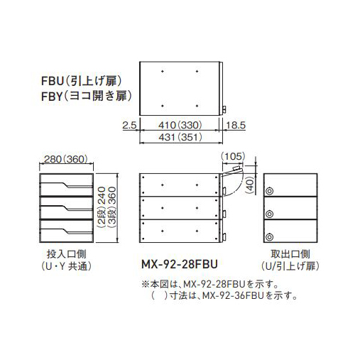 [戸数]2戸用[投入・取出側]前入後出(FB [材質]SUS304・ポリカーボネート [仕上げ・色]ホワイト [サイズ]H120×W280×D412.5mm [投入口サイズ]264×35mm [重量]5.3kg [扉]引上げ扉(U) 購入に関する注意事項 ※画像は代表画像です。 特長 ・シンプルさとフラットさを兼ね備えたデザインです。 ・多彩なバリエーションから、建物や設置スペースに合う仕様を自由に選ぶことができます。 ・前入後出(FBタイプ)は、個人情報保護に配慮し、差入口プレートを引上げるとネームスペースがあります。 ・錠前は、標準でmyナンバー錠が付いています。 ご注意 ・錠前は、オプションでラッチロック、シリンダー錠も用意しています。 ・納期:お問合せください。