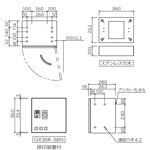 [品番]GX36K-36N[機能]捺印装置あり [寸法H×W×D(mm)]360×360×280 [錠前]プッシュボタン錠 [本体]ステンレス(SUS304)NO.4仕上0.7t BA仕上0.7t [扉]ステンレス(SUS304)ヘアライン仕上0.8t、クリアー焼付塗装 透明アクリル樹脂(GX36-60C以外) 購入に関する注意事項 ・価格には運搬費・取付費は含まれておりません。 ・納期:受注生産となります。 特長 ・「前入前出」タイプです。 ・奥行280mmタイプのコンパクトな宅配ボックスです。 ・郵便受けに投函できないネット通販等の荷物・小包・普通荷物など、荷物のサイズに合わせてご利用いただけます。 ・対面受取り不要で、再配達の依頼が不要です。24時間受取り可能です。 ・電気システムを使用していないので、メンテナンス契約をする必要がありません。 ・ボックス内部の荷物を確認するための小窓は、荷物の宛名部分が見え難い扉下部に配置し、個人情報保護に配慮しました。 ・宅配業者の方が荷物の預け入れ時に暗証番号を毎回自由に設定して施錠するため、常に暗証番号が変わり安全です。 ・捺印装置は宅配業者の方が受領印を必要とする場合にご利用ください。捺印面を裏側にして伝票を入れてボタンを押すと宅配印が捺印されます。 ・捺印装置は扉に付属し、内部は通常の宅配ボックスとしてご利用いただけます。 ・クリーンボックスは、入居者の方ならどなたでもご利用いただける、不要チラシ入れです。本体上部のスリットから投函してください。 ご注意 ・捺印装置は必ずご設置ください。受領印がないと荷物の預け入れができない場合があります。管理番号の代わりにマンション名を入れる場合は受注生産(※料金別途)となります。 ・雨がかかる場所や直射日光の当たる場所、ホコリの多い場所、高温多湿になる場所などへの設置は避けてください。 ・半屋内や常時外気の当たる場所への設置は結露により故障の原因となりますので設置しないでください。エントランスホールなどの屋内へご設置ください。 ・屋内の水平床面上に設置してください。 ・クリーンボックスは、一般のゴミは投入しないでください。 ・床置き設置では巾木を必ずご使用ください。 ・取扱説明書を世帯数分ご用意いたしますので、ご指示ください。