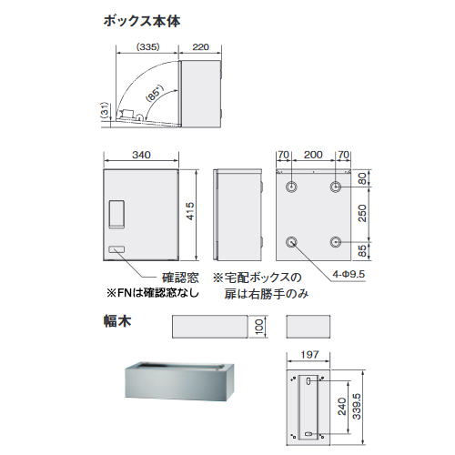 [材質]本体:高耐食溶融メッキ鋼板 t=0.8mm扉:ステンレス t=1.0mm(確認窓:ポリエチレンテレフタレート t=2.0mm) [仕上] 本体・扉:粉体塗装 [本体色]ダークブラウン [錠前] プッシュボタン錠 [サイズ] H415xW340xD220mm [入数] 1個 [重量] 6.0kg [備考]確認窓あり ●図面は、カタログPDFよりご参照ください 購入に関する注意事項 メーカー直送の運賃は、物量とお届け先住所により変動します。詳細は担当の営業所へお問合せください。 特長 ・空き状況や着荷・滞留の確認ができる「確認窓付き」です。 ・家に届く荷物の大きさや頻度を分析し、本体の薄さと容量を最適化しました。 ・受け取り可能な荷物の最大サイズはH350×W275×D140mmで、耐重量は15kgfです。 ・電源不要のプッシュボタン錠を採用し、ワンタイムパスワード式で安全面にも配慮しています。 ・宅配ボックスは右勝手のみとなります。 ・確認窓付きのみ宅配ボックス1台につき、シリアルナンバー付きの受領印が1個付属しています。住居者の受領印を代行するものとして、導入後すぐにお使いいただけます。 ・組み合わせでも、すっきりと美しく受け取りストレスのない新しいライフスタイル。 ポスト(MB36F)と宅配ボックス(TLT340)を組み合わせ、壁付けにてすっきりと美しく見せることができます。 ご注意 ・雨水が浸入しても荷物が濡れにくい防滴構造を採用しておりますが、防水構造ではありませんので、強風雨や諸条件によっては荷物が濡れることがあります。 ・取出し時は、扉を85°まで開かせることができますが、それ以上は開きません。 ・幅木を使用して床置きで設置する場合は、背面を必ず固定してください。