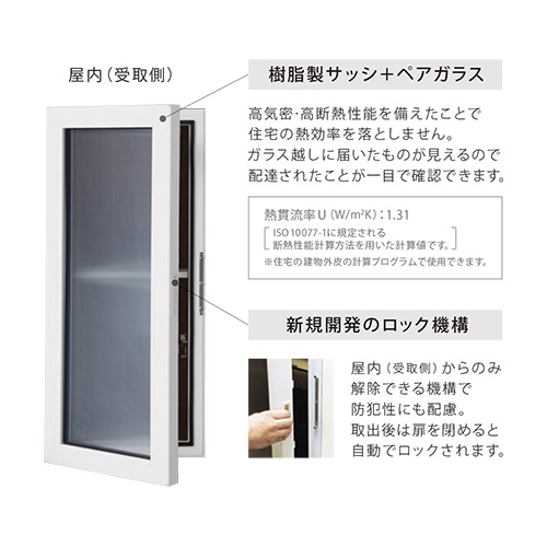 家にいてもいなくても、「家の中から受け取れる」新しい暮らし。[材質] 本体・ダクト部・フロントパネル:高耐食性溶融メッキ鋼板 t=0.8 サッシ:塩ビ(ホワイト) 型ガラス:low-Eペアガラス [仕上げ] 本体・ダクト部:粉体塗装 フロントパネル表面:フッ素加工塩ビ [本体奥行寸法(A)]標準タイプ 67mm以下(-11) [ダクト部奥行寸法(B)]155〜171mm(3) [本体色]ダークブラウン(DB) [フロントパネルシート]ミディアムウォールナット(D) [製品重量]20.6kg〜24.1kg(サイズにより異なる) [耐荷重]30kg [受取可能な最大サイズ]395x315x225mm ※みかん箱10kg相当の大きさの荷物が受け取れます。 購入に関する注意事項 屋内側、ダクト部、屋内扉は各色共通です。 寸法A 防湿シートから外壁仕上面までの寸法 -11 標準タイプ(67mm以下) -12 ロングタイプ(117mm以下) 寸法B 防湿シートから内装仕上面までの寸法 特長 ・ポストと宅配ボックスが一体になった貫通配達ユニットです。 ・封筒や手紙などの郵便物、メール便や宅配便の荷物や書留郵便など、普段の暮らしで家に届くものが、これ1台でまとめて受け取れます。 ・寒い日や台風の日、休日のお化粧前でも、家から出ずに郵便物や荷物をラクに受け取れます。 ・ポストと宅配ボックスの屋内側の受取り扉には、樹脂製サッシを採用し、高気密性と高断熱性を備えたことで、住宅の熱効率を落としません。(特許出願中) ・屋内側の受取り扉には、覗き込み防止のための光拡散効果のある型ガラスを採用しています。扉を開けなくても届いた荷物を確認できます。 ・強化ガラスを採用し、屋外からの侵入に配慮しています。 ・本体は2色より、フロントパネルシートは5色よりお選びいただけます。(ダクト部、屋内扉は各色共通です) ・屋外側の宅配ボックスの扉は右勝手のみとなります。 ・ポスト部には盗難配慮機構「ナスタガード」付です。(意匠登録済) ・不在時でも荷物の受け取りができるよう、扉の内側に印鑑ケースが設けてあります。(印鑑は付属しておりません。) ご注意 ・木造住宅用です。防火地域ではご使用いただけません。準防火地域ではご使用いただける場合がありますので各種法令をご確認ください。 ・雨水が浸入しても荷物が濡れにくい防滴構造を採用しておりますが、防水構造ではありませんので、強風雨や諸条件によっては荷物が濡れることがあります。 ・宅配物を受け取りのため、お客様ご自身でシャチハタなど三文判をご用意のうえ印鑑ケースに設置してください。 ・製品詳細図、納り図を必ずご確認のうえ仕様をお選びください。
