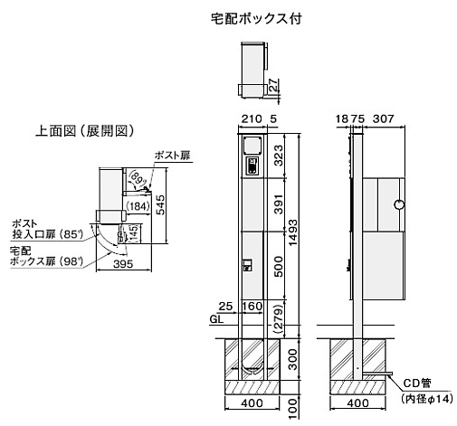 門柱ユニット インターホン取付仕様<組み上げ出荷> [サイズ]H1793×W210×D400mm(施工後の高さ:1493mm) [仕上]支柱:アルマイト処理クリア塗装、支柱オプション色:くり柾目(オレフィンフィルム) 他4色(PVC+アクリルフィルム)、名札パネル:粉体塗装 [材質]支柱:アルミニウム、名札パネル:高純度フェライトステンレス t=0.8mm、表札プレート:アクリル [質量]17.6kg [付属品]非常開錠キー2本、ポスト用スノコ2枚1セット、宅配ボックス用スノコ2枚1セット、ネームシート(ブラックまたはライトグレー)1枚、CD管ジョイント、インターホンステー1個、取付ねじ4本、表札プレート1枚、取付化粧ねじ4本 購入に関する注意事項 ・組み上げ出荷のため、受注生産品です。 ・代表画像です。画像は、支柱色が基本色(アルミニウム)です。 ・インターホン子機は別途お買い求めください。露出型インターホン子機対応。 特長 ・ポスト(前入横出/壁貫通・防滴タイプ/左右勝手)KS-MAB3を組み込んだ〈門柱ユニット〉です。 ・メール便や大型の郵便物でもスムーズに受け取れます。 ・独自開発の盗難配慮機構「ナスタガード」(意匠登録済) ・受け取るだけでなく荷物の発送もできる宅配ボックス。 ・2047通りの番号設定ができるワンタイムパスワード式のプッシュボタン錠(緊急時には付属の鍵を使って解錠可能) ・解錠・施錠のスムーズさをつい今日した専用大型ダイヤル錠。 ご注意 ・調光器を組み合わせて使用することはできません。 ・宅配ボックスは前入前出(右勝手)のみとなります。 ・「受取可能な最大サイズ」とは、宅配ボックスで受取・取出が可能な最大寸法です。最大サイズを超える荷物の受取はできません。目安寸法につき、梱包の状態によっては受け取れない場合もございます。 ・LEDが高感度である性質上、電源回路の構成状態によってはスイッチを切っても薄暗く点灯している場合があります。 ・雨水が浸入しても郵便物や荷物が濡れにくい防滴構造を採用しております。防水構造ではありませんので、強風雨や諸条件によっては郵便物や荷物が濡れることがあります。