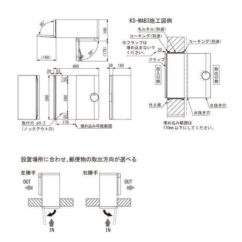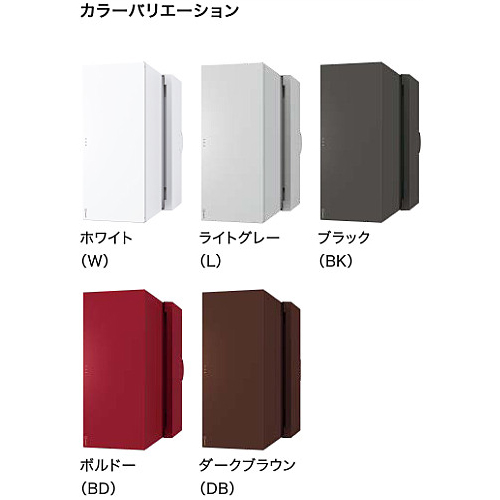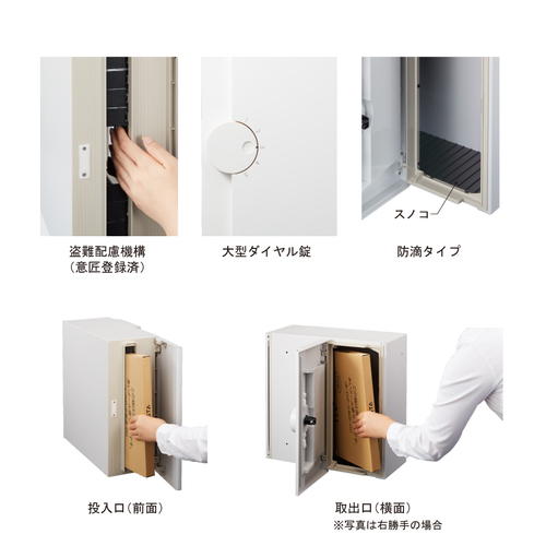 [サイズ]390×190×400mm[重量]5.1kg [左右勝手]左勝手 [色]ダークブラウン [錠前]専用大型 ダイヤル錠 [材質]本体・フラップ:高純度フェライトステンレス t=0.8mm、扉:PC樹脂、ナスタガード:PC/ABS 樹脂 [仕上]本体・フラップ:粉体塗装、扉:ウレタン焼付塗装、ナスタガード:ブラック [最大投函サイズ]350×320×厚さ35mm 購入に関する注意事項 ※代表を表示しています。 特長 ・設置場所に合わせ、郵便物の取出し方向が選べます。投入口:前面に対し、取出口:横面は右勝手と左勝手があります ・居住者、配達業者の生活動線やスペースにあわせて、取出口の方向が選択可能です。 ・通販利用などによるメール便の増加に伴い、再配達の軽減を目指した投函サイズです。(最大350×320×厚さ35mm) ・錠前は、専用大型ダイヤル錠です。開錠・施錠のスムーズさを追求した専用大型ダイヤル錠は、お子様からご年配の方まで安心で使いやすい操作感です。 ・盗難配慮機構です。独自のフラップ 構造「ナスタガード」採用により抜き取り行為に対して威力を発揮します。(意匠登録済) ・万一雨が入ってもスノコ 付で濡れにくい構造です。 ご注意 ・雨水が浸入しても郵便物が濡れにくい構造を採用しております。防水構造ではありませんので、強風雨や諸条件によっては郵便物が濡れることがあります。 ・万一雨水が浸入した場合に排水する防滴構造になっておりますが、居室に貫通する設置はおやめください。クロスや床を痛める恐れがあります。