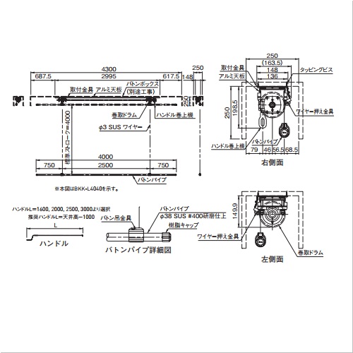 [品番/呼称]BKK-L3040[重量]25.0kg [バトン棒]Φ38 BL=3000mm [吊点数]2点 [許容積載荷重]20kg [標準ストローク]4.0m [適用ボックスサイズ]250mm×250mm×3300mm 購入に関する注意事項 ・ハンドル長さは1.6m、2m、2.5m、3mよりご選択ください。 ・別注にて、バトン棒や天板の分割仕様、バトン棒やハンドルの長さをご希望のサイズに対応します。 ・バトン棒キャップは標準ブラックですが、ご希望により、ホワイト、グレー、レッド、イエロー、グリーンに変更可能です。詳細はお問い合わせください。 特長 ・最大20kg以内での看板や垂れ幕などを簡単に吊るすことができます。 ・ウインチ式の昇降バトンのような天井内やブドウ棚での複雑な滑車の配置・ワイヤーの取り回しを考えなくても簡単に取付けできます。