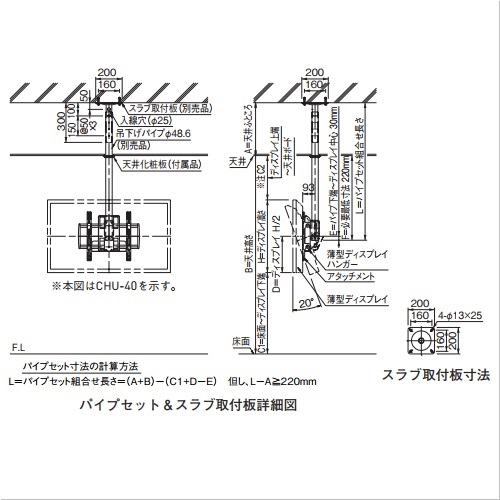 [色]N3グレー[品番/呼称]CHU-40 [重量]4.7kg [材質]スチール [仕上げ]メラミン焼付塗装 [対応サイズ]26〜40インチ(100mm×100mm・200mm×200mm・300mm×300mm) [許容積載荷重]65kgf 購入に関する注意事項 ・ご注文時に取付けディスプレイの機種をお知らせください。機種にあった取付けネジセットを同梱いたします。(一部の機種で対応できないものがあります) 特長 ・シンプルな構造で幅広いディスプレイの取付けピッチに対応しています。 ・背面カバー付きで配線などを隠すことができます。 ご注意 ・ハンガー本体のCHUには、パイプセットを含んでおりません。別途お求めください。 ・天井化粧板はハンガー本体のCHUに付属しています。 ・オプションで傾斜スラブ取付板や振れ止め金具セットもございます。