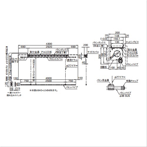 [品番/呼称]BKD-LE4040[重量]25.3kg [バトン仕様]Φ38 BL=4000mm [吊点数]2点 [許容積載荷重]20kg [標準ストローク]4m [適用ボックスサイズ]200mm×200mm×4300mm [制御]DC24V 購入に関する注意事項 ・別注にて、ご希望の色・サイズ・吊下荷重・制御・電源などに対応します。 ・BKD-LEはオプションのボルト吊金具を使う場合、適用ボックスサイズが250×250になります。 ・バトン棒キャップはBKD-LEとBKD-LAの場合、標準ブラックです。BKD-LAHBXの場合、標準ホワイトです。ご希望により、ブラック、ホワイト、グレー、レッド、イエロー、グリーンに変更可能です。詳細はお問い合わせください。 特長 ・BKD-LE:装置を隠すフロントカバー付きです。 ・BKD-LA:埋込ボックスに最適な露出タイプです。 ・BKD-LAHBX:埋込ボックスとバトンをセットにした状態で、出荷するため、組立てや取付けなどの手間を減らせます。 ・小〜中規模の会議室やホールなどで最大20kg以内の看板や垂れ幕に最適です。 ・バトンの昇降位置が変わらないシンメトリー構造です。