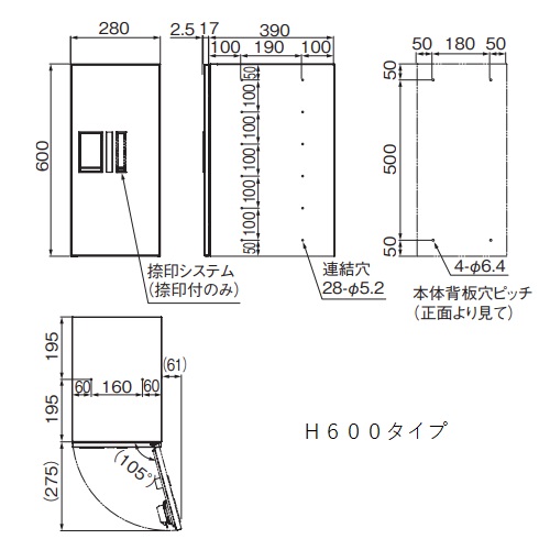 プチ宅がグレードアップして登場・さらに使いやすくなったプッシュ錠 ・IPX4の防水規格 ・スマートな捺印システム [色]ブラック [材質]本体:ステンレス t=0.7mm、扉:ステンレス t=0.8mm [仕上]本体No.4仕上、扉ヘアーライン仕上アクリル焼付塗装、色:クリア [サイズ]H600×W280×D407mm [受取可能な荷物の最大サイズ]H540×W185×D335mm [錠前]プッシュボタン錠 [重量]8.7kg ※捺印付き 購入の際のご注意 代表画像を表示しています 受注生産品です(納期お問い合せください) ご注意 ・荷物の受取りと発送が可能な宅配ボックスです(前入前出/機械式タイプ) ・防水構造(IPX4)を採用しいています。完全防水ではありませんので暴風雨や諸条件によっては荷物が漏れることがあります。 ・捺印付仕様には01〜10のボックスナンバーが同封されています。それ以外のナンバーは別途製作になります。 ・据置設置の場合はオプション(別売)で専用巾木もございます。