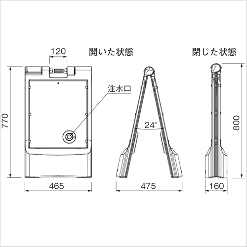 [本体色]ブラック[サイズ]H770mm×W465mm×D475mm [重量]5.1kg [材質]ポリエチレン樹脂 ●水満量時重量:約15.1kg 購入に関する注意事項 特長 ・色褪せしにくい視認性のよいカラーです。 ・強風時でも倒れにくい水タンク構造です。 ・転がせるので移動が楽に行えます。(125R) ・人や車にやさしいプラスチック製です。 ・環境にやさしい再生材を使用しています。 ・面板が簡単に差替えできます。 ・折りたためるので設置・片付けが簡単です。 ご注意 ・面板は別売です。両面に使用する場合は2枚必要です。 ・面板で表示無しのホワイトとクリアもご用意できます。お問い合わせください。 ・納期:ご確認ください。