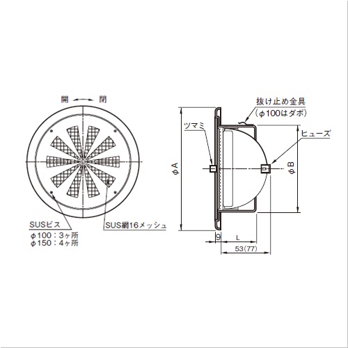 [サイズ]A:208、B:147、L:44[重量]790g [材質]SUS304 [仕上げ]研磨 [仕様]網付・FD付 [適用パイプ]エース150 152×160 [有効換気面積(給気)]37.5平方センチメートル 購入に関する注意事項 ご注意 ・防火ダンパー:公称作動温度72℃