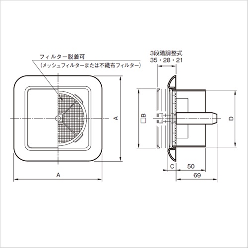 [サイズ]A:203、B:157、C:15.0、D:148[色]クールホワイト [本体重量]211g [材質]ASA [備考]不織布フィルター付 [適用パイプ]エース150 152×160 [有効換気面積(給気)]37.3平方センチメートル 購入に関する注意事項 特長 ・ワンタッチ3段階開閉機構です。軽くプッシュするだけで、風量を3段階に調整できます。 ・フェイス部は容易に取り外しができ、水洗いも可能なため、日常のお手入れが簡単です。 ・樹脂素材には帯電防止剤を配合しており、静電気による汚れも防ぎます。