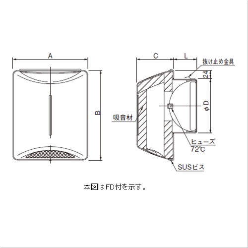 [サイズ]A:202、B:242、C:101、D:147、L:63[重量]1120g [材質]SUS304 [仕上げ]カチオン電着塗装後ポリエステル樹脂焼付塗装(シルバー) [仕様]網・FD付 [有効換気面積(給気)]28.3平方センチメートル 購入に関する注意事項 ・塗装代は別途加算となりますのでご注意ください。 特長 φ150でT-1等級相当の高い防音性能を実現しました。 ご注意 ・FD付は特定防火設備該当品です。 ・防火ダンパー:公称作動温度72℃ ・局所換気(24時間換気以外)の給気口に使用する場合は換気性能をご確認ください。 ・指定色は日本塗料工業会の色番でご指定ください。