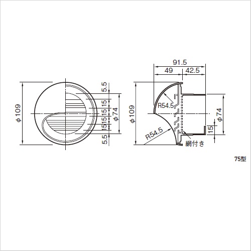 [色]ホワイトグレー[サイズ]筒外径:φ74、外径φ109 [重量]81g [材質]ABS ●適用パイプ:SU75 75× 80 ●有効換気面積:2.54平方センチメートル 【ご注意】 ・75型・100型共に網付きとなります。 購入に関する注意事項