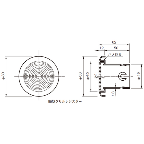 [色]ホワイトグレー[サイズ]筒外径Ф49、外径Ф80 [本体重量]39g [材質]ABS [適用パイプ]SU50 50×54 [有効換気面積]10.4平方センチメートル 購入に関する注意事項