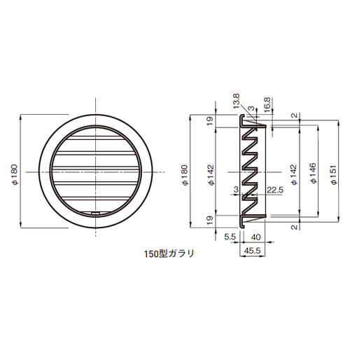 [色]ホワイトグレー[サイズ]筒外径Ф151、外径Ф180 [本体重量]130g [材質]ABS [適用パイプ]エース150 152×160 [有効換気面積]95平方センチメートル 購入に関する注意事項 ご注意 自然換気用としてご使用ください。