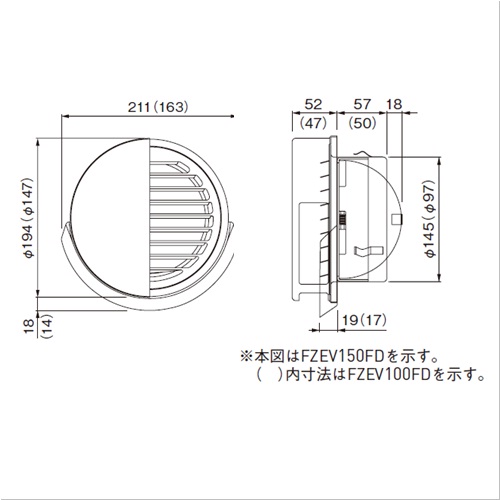 [色]メタリックグレー(MG)[サイズ]表記による [重量]889g [材質]SUS304 [仕上げ]カチオン電着下地塗装 [適用パイプ]エース150 152×160 [相当開口面積]59.53平方センチメートル 購入に関する注意事項 ※代表を表示しています。 備考 ・フードが丸く、フラットですっきりした外観です。 ・通気量を確保しつつ、耐外風や雨水浸入、外壁面の汚れの減少など優れた性能を発揮します。 ・強制換気用としてご使用いただけます。 ・同じ外観で、強制換気用を選びたい場合は、こちらをご使用ください。 ・ガラリの羽根は下向きです。 ・水板し板は付いておりません。 ご注意 ・FD付の機種は特定防火設備該当品です。 ・防火ダンパー:公称作動温度72℃(120℃も対応可能です。お問い合わせください) ・別注色も製作可能です。