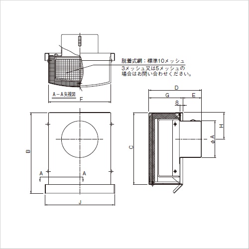 ・次世代吸音材を採用(ダイポルギー吸音フォーム)リサイクル可能な環境に優しい素材です。・一般型や外風雨浸入対策型などとデザインを統一できます。 ・標準で10メッシュ付です。オプションで5メッシュ・3メッシュが選択できます。 ・吸音材のメンテナンスが簡単です。 [品番/呼称]DS-200TESS10M-DP [サイズ]A:197、B:305、C:275、D:209、E:81、F:240、G:128、H:120、J:270 [重量]1400g [材質]ステンレス [仕上げ]カチオン電着+シルバー焼付塗装 [仕様]網付 [適用パイプ]VU200 202×216 購入に関する注意事項 ご注意 ・塩害地区にご使用の際は、別途特別塗装を推奨しております。 ・メンテナンスができる場所にて使用してください。 ・別注にて色指定による塗装も対応できます。