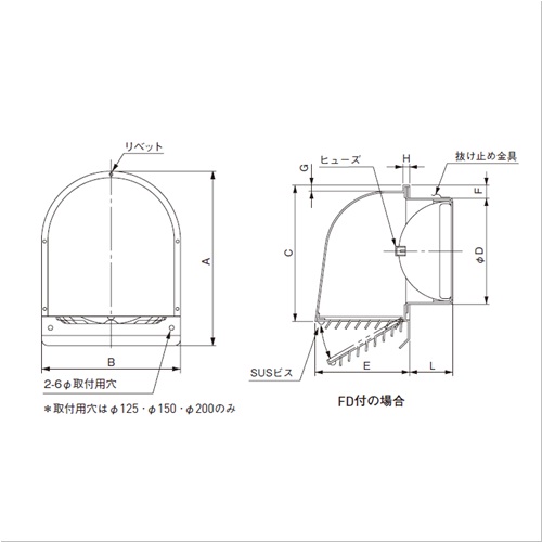 [サイズ]A:176、B:136、C:138、D:97、E:86、L:53、F:17、G:8、H:6[重量]510g [材質]SUS304 [仕上げ]カチオン電着塗装後、ポリエステル焼付塗装(シルバー) [仕様]FD付 [適用パイプ]SU100 100×106 [有効換気面積(給気)]27.6平方センチメートル 購入に関する注意事項 ・塗装代は別途加算となりますのでご注意ください。 ご注意 ・FD付は、特定防火設備該当品です。 ・防火ダンパー:公称作動温度72℃ ・防虫網付も製作可能です。(SUS10メッシュ) ・指定色は日本塗料工業会の色番でご指定ください。