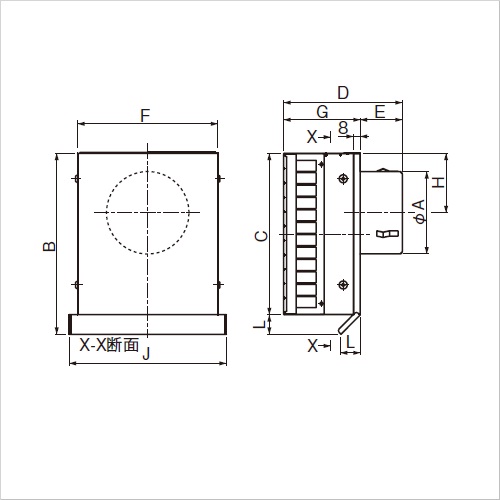 ・左右吹き抜けタイプです。耐雨性能に優れています。・圧力損失が低いため、機器への負担を軽減できます。また省エネの一環にも役立ちます。 ・排気流を外壁から遠ざけることにより汚れを軽減できます。 ・左右開口にすることにより、妻側はもちろん軒下、軒上などにも取付け可能です。 [品番/呼称]DS-100YFGT [サイズ]A:97、B:213、C:190、D:139、E:49、F:165、G:90、H:70、J:185、L:23 [重量]805g [材質]ステンレス [仕上げ]カチオン電着塗装+シルバー焼付塗装 購入に関する注意事項 ご注意 ・塩害地区にご使用の際は別途特別塗装を推奨しております。詳しくはお問い合わせください。 ・別注にて色指定による塗装も対応できます。 ・特注サイズも製作可能です。