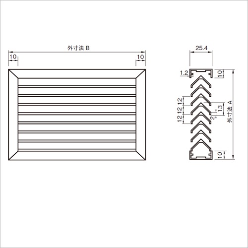 [外寸法]A200mm、B600mm[奥行寸法]25.4(20) [取付開口寸法]H202mm、W602mm [重量]1320g [材質]アルミ [仕上げ]アルマイトシルバー [有効換気面積]523センチ平方メートル 購入に関する注意事項 ご注意 ・平均換気率:50%です。 ・特注サイズも製作可能です。 ・品切れ後、奥行き寸法が25.4mmから20mmに変更となります。