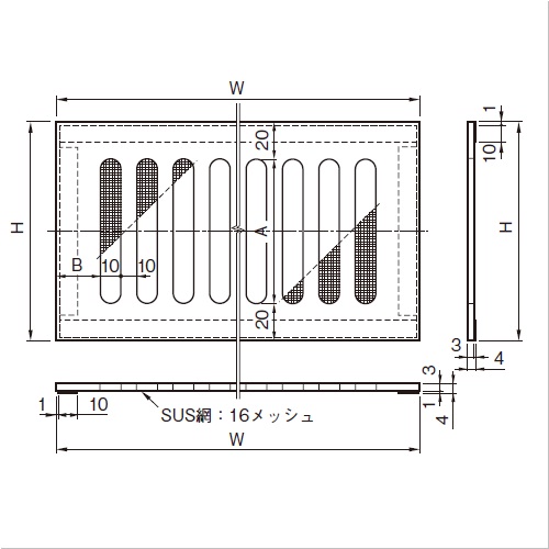 [サイズ]300x120x3mm[本体重量]650g [材質]SUS304 [仕上]サテン研磨 ●有効換気面積:65平方センチメートル 【ご注意】特注サイズ製作可能です。(穴ピッチ考慮必要) 購入に関する注意事項