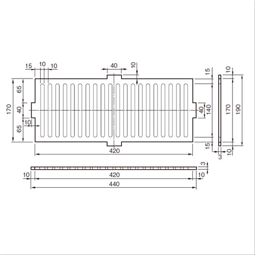 [サイズ]420x170x3mm[本体重量]1000g [材質]SUS304 ●有効換気面積:275平方センチメートル 【ご注意】網付の場合はSUS304 16メッシュ貼りとなります。特注サイズ製作可能です。(穴ピッチ考慮必要) 購入に関する注意事項