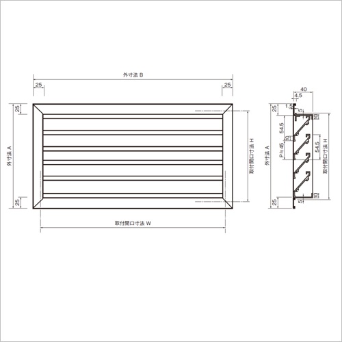 ・折返しの付いた特殊なルーバー形状(アルミ型材)のため、雨水浸入を防止します。(耐雨)・厚型タイプで外壁用・内壁用・間仕切用としてご使用いただけます。 [サイズ]外寸法:A540mm、B540mm [重量]2250g [材質]アルミ [仕上げ]アルマイトシルバー [ご注意] ・網付も製作可能です。 ・別注サイズも製作可能です。 ●取付開口寸法:H500mm、W500mm ●有効換気面積:675センチ平方メートル 購入に関する注意事項