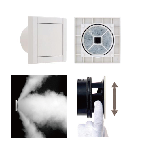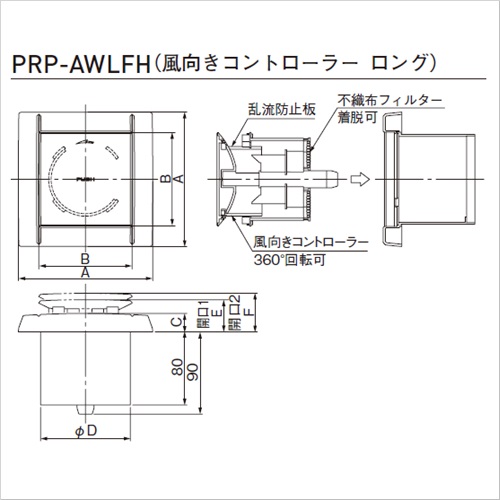 [色]クールホワイト[サイズ]A:207、B:157、C:21、D:148、E:50、F:57 [材質]ASA(機構部:ABS) [重量]517g ●適用パイプ内径φ150 ●有効換気面積(給気):22.9平方センチメートル 購入に関する注意事項 特長 ・給気した空気を壁面に沿うことなく、斜め前方向に放出します。また、結露水をレジスター内で溜められます。 ・フェイス部中央をプッシュすることで閉鎖・中開・全開と給気風量をコントロールすることができます。 ・放出方向は、PRP-AW:4方向、PRP-AWS:3方向、PRP-AWL:2方向です。PRP-AWS(3方向)とPRP-AWL(2方向)は風向きコントローラーがついており、風向きを90°ずつ回転させることができます。PRP-AW(4方向)は風向きコントローラーはついておりません。 ・機構部裏面にフィルター部を設けたことにより、メンテナンスも容易に行なえます。 ・不織布フィルター付きなので、外気に含まれる塵やホコリなどの室内への侵入を防ぎます。(水洗い可能3〜5回) ご注意 ・不織布フィルター捕集効率 60%(質量法 JIS 15種) ・フィルターなし(PRP-AW)やメッシュフィルター付(PRP-AWF)もございます。お問い合せください。 ・風向きコントローラーには向かい合わせの2面を塞ぐ対向タイプもございます。