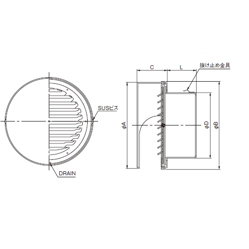 [サイズ]A143、B145、C48、D97、L56mm[適用パイプ内径]SU100 100×106mm [有効換気面積(給気)]34.1cm2 [重量]280g [材質]SUS304 [仕上げ]カチオン電着塗装後、ポリエステル樹脂焼付塗装(シルバー) 購入に関する注意事項 ・画像は代表画像です。 ・塗装代は別途加算となりますのでご注意ください。 ・防虫網付きは別途加算となりますのでご注意ください。 特長 ・製品の左右に設けたビスによりカバー部の脱着が可能なためダンパーのメンテナンスや清掃が容易に行えます。 ・ベース部の外周に設けたシール代により安全な施工がはかれます。 ご注意 ・指定色は日本塗料工業会の色番でご指定ください。 ・3メッシュ、5メッシュも製作可能です。 ・防虫網付も製作可能です。