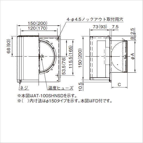 [品番/呼称]AT-150SHNSD[サイズ]A:147、B:20、C:73 [重量]0.9kg [材質]SUS304 [仕上げ]粉体焼付塗装 [仕様]網・FD付 [適用パイプ]エース150 152×160 [有効開口面積]36平方センチメートル 購入に関する注意事項 特長 ・フード下のネジ2ヶ所を外せばコーキングを切ることなくフードが取外せ、メンテナンスも容易です。 ・防音効果 500Hz域にてφ100:約34dB、φ150:約30dB。 ・φ150タイプ単体で「T-1」相当の防音性能を実現。 ご注意 ・屋外から点検できる場所に取付けてください。 ・重塩害地区に設置する場合は、お問い合わせください。 ・指定色塗装は、(一社)日本塗料工業会の番号をご指定ください。(納期:お問い合わせください) ・網目は10メッシュのみになります。 ・フード脱着のため天井とフード上部の隙間が10mm以上必要となります。 ・雨滴音低減品もございます。(AT-SHNSUT・AT-SHNSUTD) ・VP(厚肉)管にはφ150タイプは取付けられません。 ・FD付は防火設備該当品です。(第01EG021号) ・防火ダンパー:公称作動温度72℃