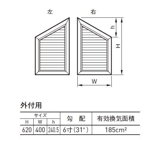 [色]シルバー(S)、ブロンズ(BN)、アイボリー(WI)、ブラック(BK)、ステンカラー(STN)、ダークブロンズ(DB)[品番/呼称]K5568R(S,BN,WI,BK,STN,DB) [サイズ]H:620mm、W:400mm、h:240.5mm [重量]2.5kg [材質]アルミ ●勾配:6寸(31°) ●有効換気面積:185センチ平方メートル 購入に関する注意事項 ご注意 色をご指示ください。
