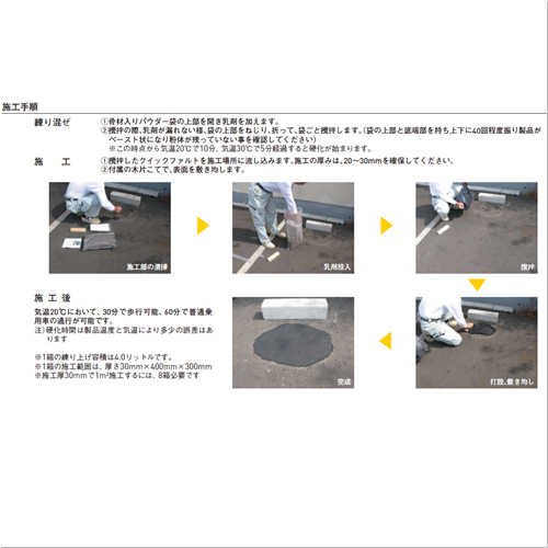 施工道具不要で、セット内容の乳剤を骨材入りパウダー袋に入れて袋ごと混ぜるだけでアスファルト補修が簡単にできます。既存のアスファルト・コンクリート面に重ねて打設しても強力に接着するので施工後の割れ、剥がれは通常のセメント施工より十分な強度があります。 突き固めた土の上にも施工できます。 施工後30分で歩行、60分で普通乗用車の通行ができます。 (気温20℃において)駐車場や工場内のアスファルト・コンクリートの凹み等の補修、フォークリフト通路・車椅子通路・台車通路の段差解消、電柱・標識・設備器具設置後の補修として最適です。 [本体重量]17800g ●備考:可使10分型 【ご注意】降雨時、及び5℃以下での施工はお止めください。他の材料を一切加えたりせず、調整をしないでください。施工箇所に水が溜まっている場合は、水を除去してください。降雨が予想される場合は、雨養生をしたうえで施工してください。残った材料・袋類・道具は、産業廃棄物として処理してください。施工場所の環境によっては、エフロが発生します。製品はパウダーが乳剤と反応して硬化します。施工直前に開封をし長期保管を避けて早めにお使いください。製品は、普通ポルトランドセメントを使用していますので、粉塵が立ち易く水に濡れると強アルカリ性を示します。取扱いに際しては保護具(防塵マスク・ゴム手袋)をご使用ください。万一、皮膚に付着した場合は、直ちに清浄な水で十分に洗い流してください。又、誤って目に入った時、吸引をした時、飲み込んだ時は、直ちに洗浄等の応急処置を施し速やかに専門医の診察を受けてください。411-152 クイックファルト2は、骨材入りパウダー×2袋、乳剤×2袋の材料のみをセットした商品です。専用工具(木片こて)、施工要領書は入っておりません。 購入に関する注意事項