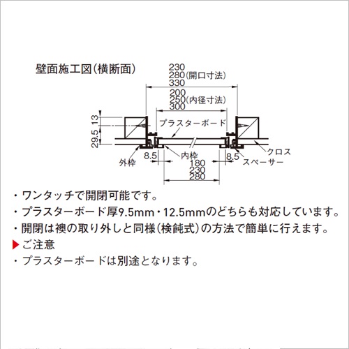 [材質]塩ビ[色]オフホワイト [開口サイズ]280×480 [内径サイズ]250×450 [重量]495g 購入に関する注意事項 ※代表を表示しています。 特長 ・ワンタッチで開閉可能です。 ・プラスターボード厚9.5mm・12.5mmのどちらも対応しています。 ・開閉は襖の取外しと同様の方法(ケンドン式)で簡単に行えます。 ご注意 ・プラスターボードは別途となります。