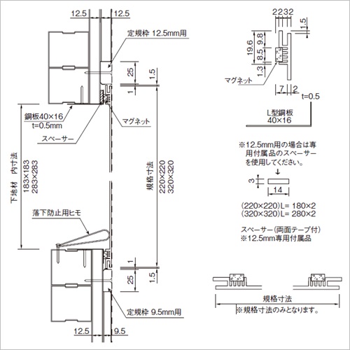 ・点検しやすいマグネット式です。・フレームを見せないクロス巻込仕上げです。 [色]ホワイト [サイズ]220mm×220mm [重量]394g [付属部品]・定規枠(樹脂製クラフト紙貼り) ・L型鋼板(2枚) ・落下防止ヒモ(Sカン付) [材質]ABS樹脂 [ご注意] ・プラスターボード9.5mm、12.5mm用です。厚さをご指定ください。 ・規格寸法品のみとなります。 ・クロス接着には、プラゾールS(ヤヨイ化学)、またはボンドSP21ON(コニシ)をご使用ください。 ・12.5mm用は3mmスペーサー(2枚)が付きます。 ・バラ出荷も可能です。但し、梱包費が別途かかります。 購入に関する注意事項