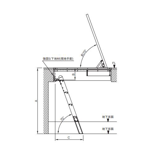 [呼称] UDS-160EN[サイズ] 床面〜地下床面高さ(A)1613〜1863mm、床面〜受けパイプ取付高さ(B)床面より-248.5mm、設置スペース〜壁(C)666〜757mm [色] ホワイト [重量] 6.5kg [材質] アルミ [立掛け角度] 70° [踏板数] 6 [許容荷重] 120kgf 購入に関する注意事項 特長 ・長さ調整ができる調整脚(白色)は木製のため現場で切断可能です。 ・ハシゴ受け金具のキズ防止のため引っ掛け金具にはビニールホースを通しています。また、ハシゴ受け金具に対して横ズレが起きにくいため安全です。 ・組合せ例のNFH-80GAの場合は、ステップの立て掛け角度と天板開閉角度(約70°)がほぼ同じため平行に昇降できます。 ご注意 ・一般家庭の屋内専用です。屋外、屋側には設置しないでください。 ・ハシゴは床下だけでなく、部屋でもご利用いただけます。 ・調整脚は木製のため地下床面に水気がある場合は設置しないでください。 ・店舗など使用頻度の激しい場所ではご使用いただけません。 ・木製調整脚(白色)の切断は、コルク面が地下床面と接地するようにし、取付けは必ず先き穴をあけビス止めしてください。 ・床下開口ハッチ本体への固定は強度不足を起こし事故や故障の原因となります。 ・ハシゴ受けパイプ1セット商品に同梱、手摺は別途です。 ・特注サイズも製作可能です。 ・納期:受注生産となります。 ・画像は代表画像になります。
