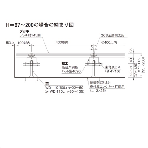 「エフレックス」(屋外)※ 束用接着剤です。カートリッジタイプなので、ご使用の際は別途、カートリッジガンが必要です。束用接着剤「束職人」(屋内)張り合わせ可能時間/20分 [品番/呼称]WD-110(60L) [サイズ]22mm〜50mm [重量]399g [材質]スチール [仕上げ]高耐食溶融メッキ・溶融亜鉛メッキ [ご注意] ・WD-110(60L)はデッキ高さ87 〜95mm、WD-110Lはデッキ高さ95 〜175mmの 場合は、現場でボルトをカットする必要があります。 ●備考:ハット型受プレート、取付けビス3本、コンクリート釘2本付属 購入に関する注意事項 備考 他サイズもございます。お問合せ下さい。