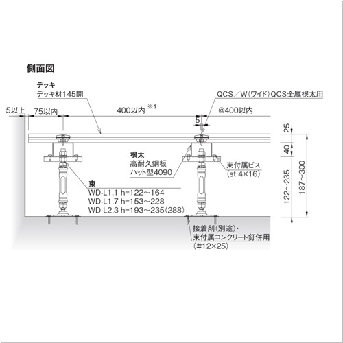 「エフレックス」(屋外)※ 束用接着剤です。カートリッジタイプなので、ご使用の際は別途、カートリッジガンが必要です。束用接着剤「束職人」(屋内)張り合わせ可能時間/20分 [品番/呼称]WD-L1.7 [サイズ]153mm〜228mm [重量]667g [材質]スチール [仕上げ]高耐食溶融メッキ・溶融亜鉛メッキ [ご注意] ・WD-110(60L)はデッキ高さ87 〜95mm、WD-110Lはデッキ高さ95 〜175mmの 場合は、現場でボルトをカットする必要があります。 ●備考:ハット型受プレート、取付けビス3本、コンクリート釘2本付属 購入に関する注意事項 備考 他サイズもございます。お問合せ下さい。