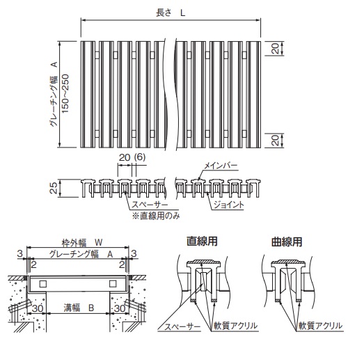 [色]ホワイト[品番/呼称]GAP-25W200-S [サイズ]幅200mm、高さ25mm、長さ1000mm [重量]2.4kg 購入に関する注意事項 ・法人様限定商品となります。建築現場や個人宅への配送は不可となりますのでご了承ください。 ・納期:ご確認ください。 特長 ・プールの排水溝にご使用いただけます。 ・曲線調節は無段階で調節可能(最小R設定あり)長さ調節も現場で簡単にできます。 ・屋外使用可。耐熱水・耐候性に優れています。 ・上面が軟質アクリルのため、水に濡れても滑りにくく安全です。 ・直線部でのすき間は6mm以下なので、お子さまの指も入らず安全です。 ・底部にも軟質アクリルを採用しているので、ズレやガタつきを抑制します。 ・上面がかまぼこ状で水はけ抜群です。 ・巻取り収納が可能なため、メンテナンスや清掃が容易です。 ・クイックジョイント仕様のため、1枚ごとの連結がスムーズにできます。 ご注意 ・ジョイントのカラーはライトグレーのみです。 ・最大幅250mmまで、溝幅に合わせて特注対応可能です。詳細はお問い合せください。 ・価格及び出荷は500mm又は1000mm単位です。総数量にてご注文ください。 ・長さはジョイント部の伸縮機能により995mm〜1020mm程度に調整できます。 ・曲線対応の受枠も製作いたします。詳細はお問合せください。 ・メインバーの材質は、硬質塩化ビニル(PVC)/軟質アクリルです。 ・浴室出入口には使用できません。 ・直線部には、伸縮しにくい「直線用」をご注文ください。