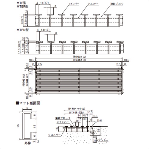 ステンレス鋼製フォーミング材 Tバータイプの玄関マットです。3タイプの表面加工から選べ、盗難防止、はねあがり防止用としてボルト固定タイプも製作できます。 [サイズ] 外枠幅W2:591 外枠長さL2:892 本体幅W3:570 本体長さL3:871 高さH:15 ピッチP:14 スキマS:6 [本体重量]9.5kg [材質]SUS304 [仕上げ]凹凸(MTEN) ●マット本体割数:1 【ご注意】 ・ハイヒールの踵の落ち込みを防ぐには、ピッチ14mmをご使用ください。 ・メインバーのピッチは14mmと17mm、高さは15mm以外に20mmもあります。 ・W寸法(ピッチ方向)1000mm、L寸法(メインバー長さ寸法)2000mmまでのご指定寸法で製作いたします。但し、重さ25kgまで。 ・隅切、切り欠きもできます。 ・ボルト固定仕様加工(蓋高さ15mm用)は、本体・外枠セットの1枚割での加工代金(\10,600)です。2枚割の場合は、2セットの価格になります。ピッチ14、17の価格は共通です。 ・本体+外枠のセット価格です。 購入に関する注意事項
