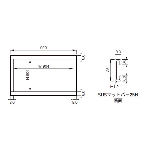 [サイズ]8×25×4000[本体重量]2000g [材質]SUS304 [仕上げ]研磨 【ご注意】 ・外寸法はマットサイズH・W共にプラス20mmです。 ※内寸法H600×W900の場合[604×2本/920×2本]で切断 ・アンカーは枠材に適当数(約300mmの間隔で)スライドして差込みます。 ・組立後にアンカーは取付けられません。必ず組立前に入れてください。 ・納期:ご確認ください。 購入に関する注意事項 【要別途送料】別途送料が必要な商品です。詳細は営業へお問合せください。