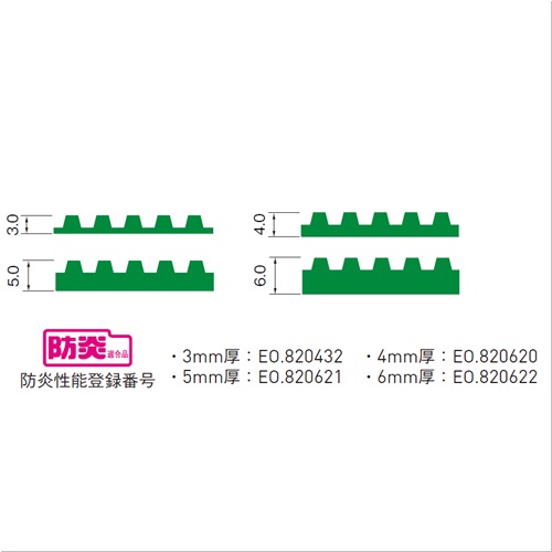 ・筋入りで適度なクッション性もあります。・床の保護用としてはもちろん、通路の防音、滑り止め、除廛用としてもご利用いただけます。(屋外での使用は変色の恐れがありますのでご注意ください) [色]2色の中から(グリーン、グレー) [品番/呼称]F-25-12-6 [サイズ]幅1.2m×10m×6mm [重量]約96kg [材質]ゴム [ご注意] ・規格サイズのみで別注サイズやカット売りはできません。 ●6mm厚:防炎性能登録番号EO.820622 購入に関する注意事項