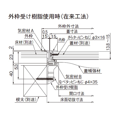 [材質]アルミ[色]ステンカラー [サイズ]開口寸法:555、外枠外寸法:620、蓋寸法:589、床面切抜寸法:600、蓋仕上材切断寸法:577 [備考]都市機構・気密タイプ [重量]2.20kg 購入に関する注意事項 ※画像は代表画像です。 特長 ・置床工法、在来工法両用タイプです。 ・厚さ15mmフロア材で2枚以上繋ぎ合わせる場合は、SHF21/SHW21をご使用ください。 ・12mmの合板にクッションフロア(t=1.8〜3)を貼り合わせることもできます。 ・気密性能(JIS A 4706)A-4等級相当 ご注意 ・12mmのフロア材を使用する場合は、2.5mm程度の合板(ベニヤ板)を捨て張り(接着)してください。 ・スピードクリッパーは、フロア材とパーティクルボードとの厚さ合計が25〜45mmの間で適用します。 ・取手用穴あけ寸法は18×83mm(角穴もしくは長穴)です。