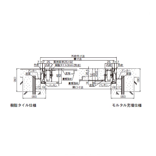 [材質]枠:SUS304 底板:SUS430[仕上]ヘアーライン [備考]樹脂タイル・モルタル充填兼用 [耐荷重]樹脂タイル仕様:3.5kN/平方メートル モルタル仕様:5kN/平方メートル [サイズ]開口寸法:262、外枠外寸法:300、蓋寸法:284 [本体重量]3.2kg 購入に関する注意事項 特長 ・FSR型は、蓋の反転により樹脂タイル仕様またはモルタル仕様になる兼用タイプです