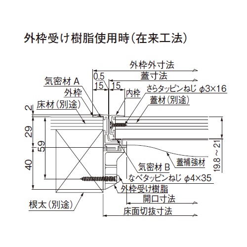 [材質]アルミ[色]シルバー [サイズ]開口寸法:405、外枠外寸法:470、蓋寸法:439、床面切抜寸法:450、蓋仕上材切断寸法:427 [備考]t21mm用・気密タイプ、t25mm以上用・一般タイプ [重量]1.63kg 購入に関する注意事項 ※画像は代表画像です。 特長 ・気密性能(JIS A 4706)A-4等級相当 ・厚さ21mmフロア材で2枚以上繋ぎ合わせる場合はご使用になれません。 ・18mmの合板にクッションフロア(t=1.8〜3)を貼り合わせることもできます。 ・置床工法、在来工法両用タイプです。 ご注意 ・ 15mmのフロア材を使用する場合は、5.5mm程度の合板(ベニヤ板)を捨て張り(接着)してください。 ・ スピードクリッパーはフロア材とパーティクルボードとの厚さ合計が31〜51mmの間で適用します。 ・ 取手用穴あけ寸法は18×83mm(角穴もしくは長穴)です。