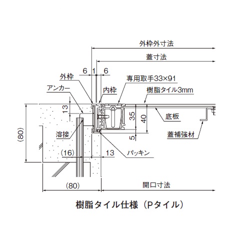 [材質]枠:アルミ 底板:スチール[仕上]枠:アルマイトシルバー 底板:溶融亜鉛メッキ [サイズ]開口寸法:424、外枠寸法:450、蓋寸法:436 [耐荷重] ・樹脂タイル仕様:3.5kN/m2 ・モルタル仕様:5kN/m2 [本体重量]5.8kg 購入に関する注意事項 特長 ・4HA2型は蓋の反転により樹脂タイル仕様またはモルタル充填仕様になる兼用タイプです。 ご注意 ・(一社)公共建築協会認定品です。
