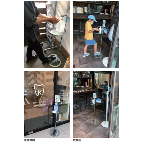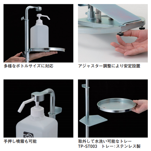 安全性、使い勝手、デザイン性、耐久性を大切に、ものづくりの町大田区町工場職人が作り上げました。「さぁ、踏み出すことからはじめよう。」 [型式]TP-ST003 [材質]本体:スチール、トレー:ステンレス [仕上]本体:ユニクロメッキ、トレー:研磨 [サイズ]幅300mm×奥行260mm×高さ990mm(パネル設置時1140mm) [重量]8.5kg [高さ調整]アジャスター有 購入に関する注意事項 ・使い方パネルは標準で含まれています。 ・アルコール消毒液及びボトルはご自身でご用意ください 特長 ・手を使わない足踏み式のアルコール消毒液スタンドです。 ・「手指の消毒にご協力ください」と書かれた使い方案内パネルにより、消毒を促すことがてきます。 ・安定性とインテリア性を重視した丸みを帯びたスタイリッシュなデザインです。 ・本体重量の半分以上を下部ベースに集中させることで安定性を確保しました。 ・不安定な場所でも使いやすいようアジャスターで調整可能です。 ・大きなペダルを採用し、付属の足型ゴムシートを貼り付けることで視認性をアップさせました。足のマークは滑り止めの役割も果たします。 ・消毒液の液だれを防止する大きいトレーは簡単に取り外せ、水洗い可能です。 ・足の不自由な人や足踏みが苦手な方でも使用できるよう、手押しによる噴霧も可能です。 ・ポンプ噴出タイプのアルコール消毒液スプレーボトルであれば、多様なボトルサイズに対応します。 ・ボトルサイズはφ32mm程度まで、ノズルはφ8mm程度まで設置可能です。ノズルが左右にぶれないように切込み加工が施されています。 ・脚となるベースサイズは幅約30cm×奥行約26cmです。背面側はフラット形状なので壁側に寄せてお使いいただけます。 ご注意 ・アルコール消毒液は含まれておりません。 ・スプレーボトルは含まれておりません。 ・市販のスプレーボトルを別途ご用意ください。 ・使い方案内パネルの表示内容は変更予定です。 付属品 ・使い方パネル:1 枚 ・トレー:1枚 ・化粧ビス:4本 ・足形シート(両面シール付):1セット ・取扱説明書:1部